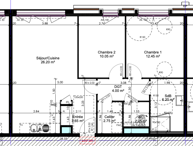 Logement d’une surface d’environ 67,55m2 comprenant : entrée, cuisine ouverte sur séjour, 2 chambres, salle de douche, wc et cellier.