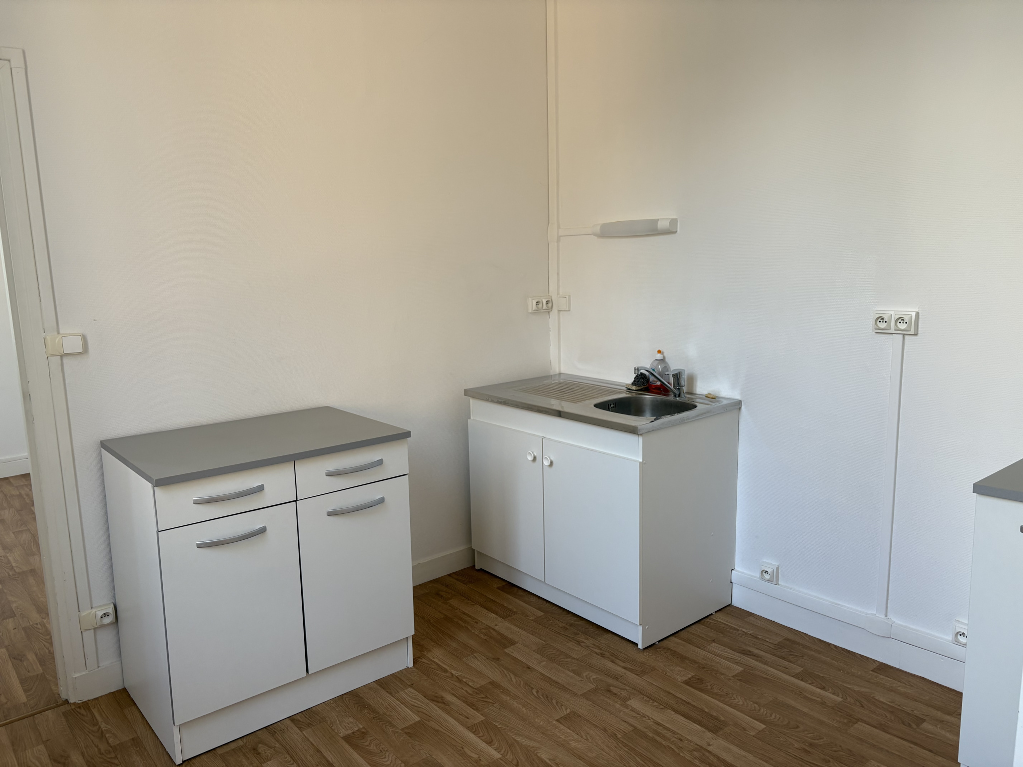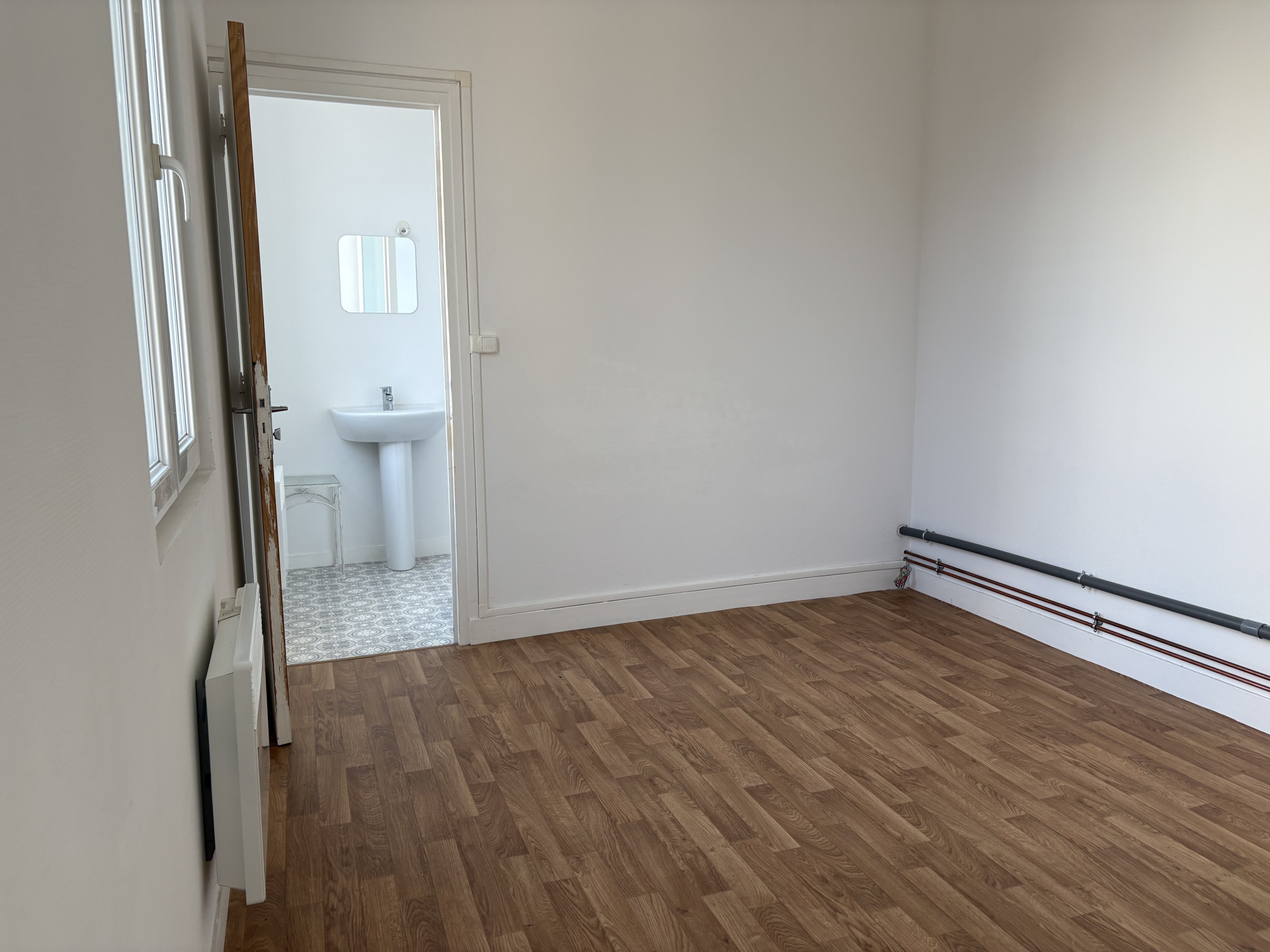 Local commercial libre, couloir desservant trois pièces, salle de douche et WC. Sur une surface d’environ 53m2.