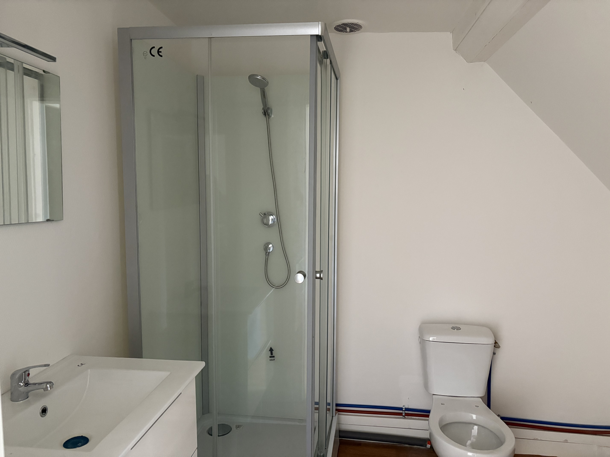 Au deuxième niveau : deux chambres mansardées et une salle de douche avec WC.