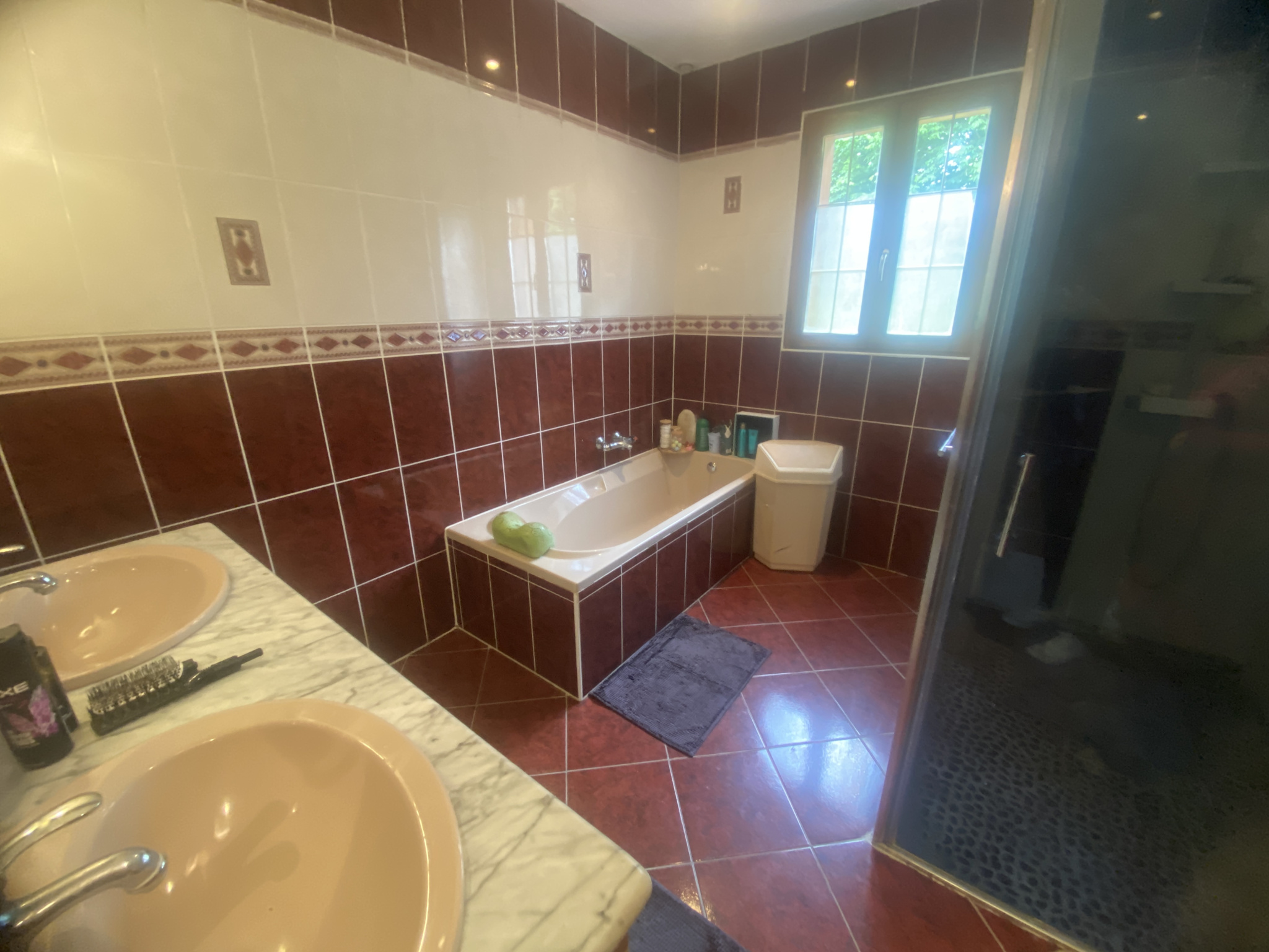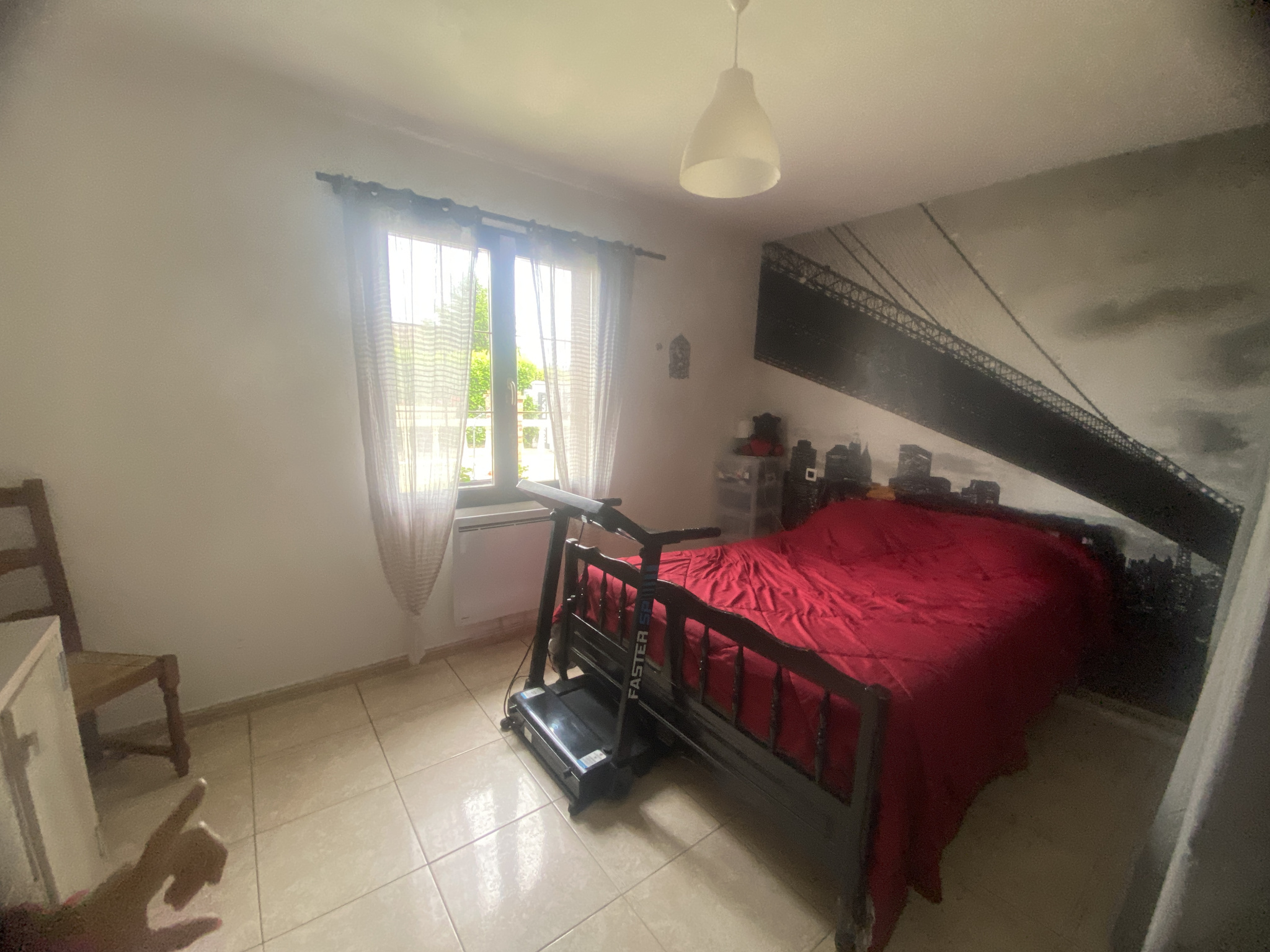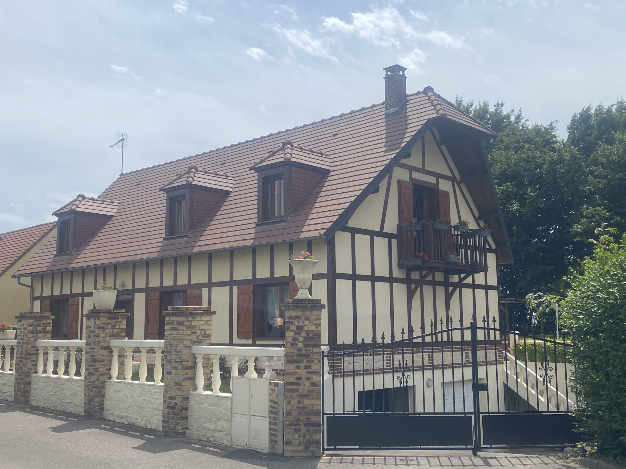 A l’étage, grand palier désservant 3 chambres dont une avec un balcon, salle de douches avec wc.