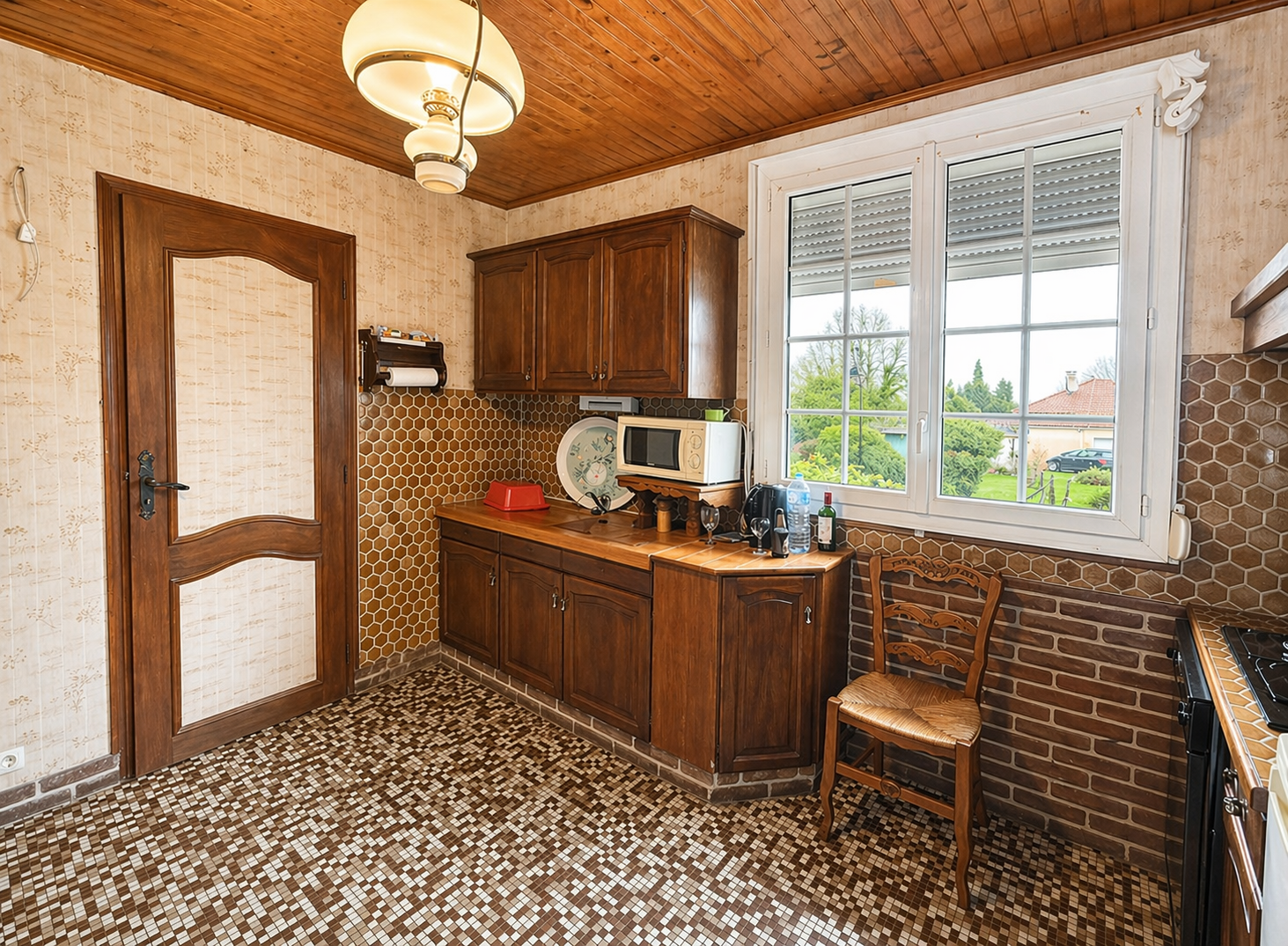 – Au rez-de-chaussée : entrée, wc, cuisine, séjour donnant sur une véranda, 2 chambres et une salle de douche.